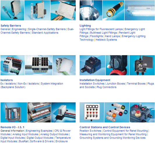Концерн R.Stahl считается ведущим производителем взрывозащищенной продукции, которая на сегодняшний день включает в себя: искробезопасные барьеры, разделители и распределенные системы (Remote I/O), взрывозащищенные посты управления, взрывозащищенные светильники (подвесные, настенные, потолочные, ручные и др.), взрывозащищенные распредщиты электрообогрева и освещения, взрывозащищенные командные и сигнализирующие приборы (светофоры, сирены, вспышки), материалы для монтажа и принадлежности (установочные выключатели, ответвительные коробки, клеммные коробки, штекерные устройства, муфты, заглушки, адаптеры, редукторы и др.), комплексные решения задач взрывозащиты.